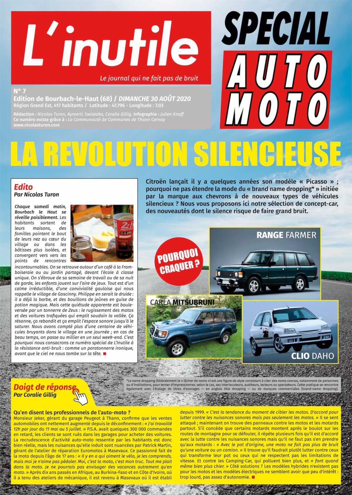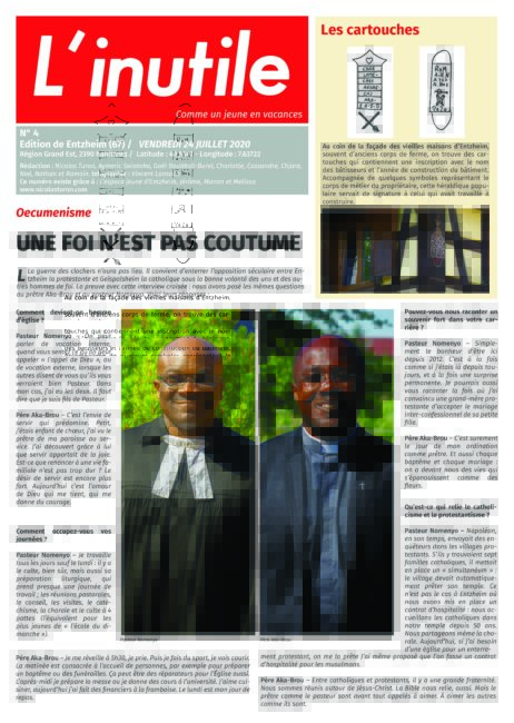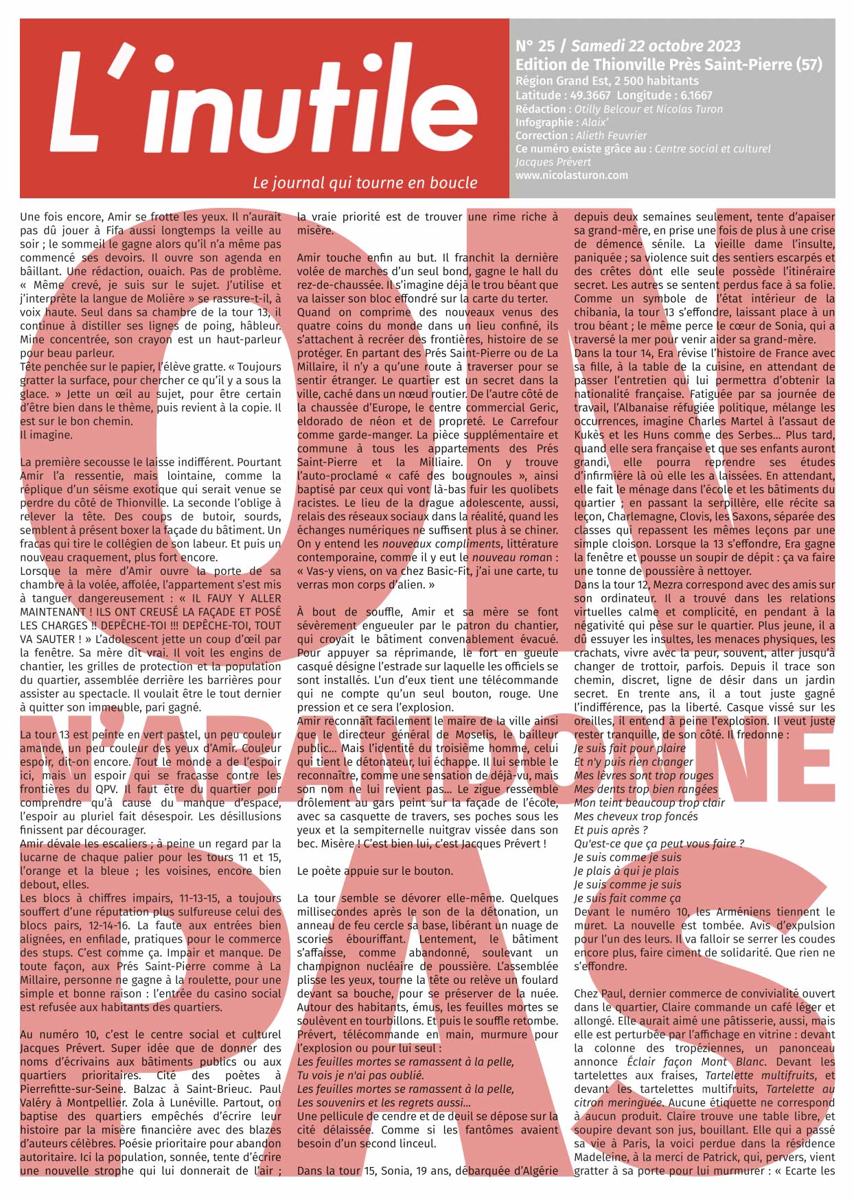 Action créée en réaction à la crise du COVID-19, mettant en jeu tous nos savoir-faire, de la rencontre et la capacité d’écoute à la transformation des histoires vernaculaires en matière artistique, l’idée est de créer un journal gratuit, sur le modèle de 20 minutes ou Metro, mais dans un lieu de « déconcentration » de population. Un journal de nouvelles qui n’intéressent personne pour les lieux qui n’en n’ont pas besoin.